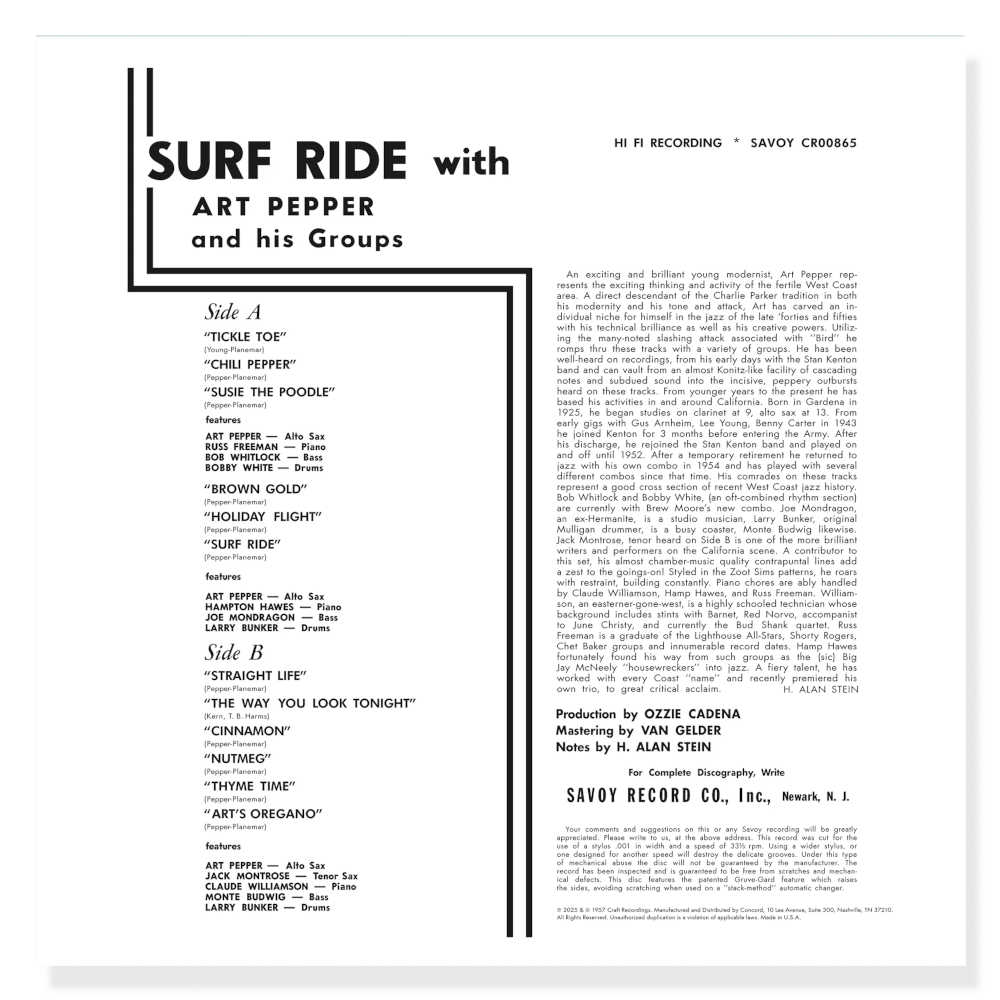 Including sessions recorded by Art Pepper for Savoy from 1952-54, Surf Ride was originally released in 1956. Featuring three groups of players, the album collects twelve, mostly Pepper composed, cuts including "Holiday Flight" — with Pepper's playing throughout on superior form. This new edition of the album is released as part of the Original Jazz Classics Series on 180-gram vinyl pressed at RTI with all-analog mastering from the original tapes at Cohearent Audio and a Stoughton Tip-On Jacket.